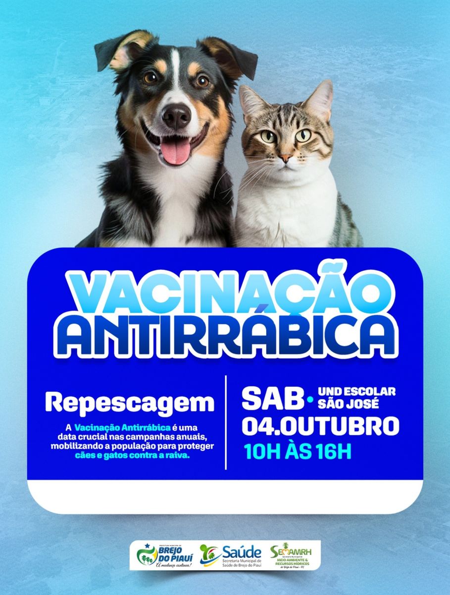 A Prefeitura de Brejo do Piauí realiza neste sábado uma repescagem da vacinação antirrábica na Unidade Escolar São José, entre as 10h e as 16h. A iniciativa é voltada para cães e gatos que ainda não receberam a dose da campanha, garantindo a proteção contra a raiva, doença grave e letal que pode ser transmitida aos seres humanos.